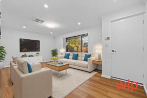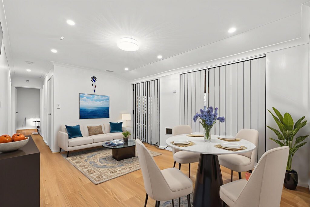 The light-filled living room welcomes you with large windows and brand-new modern light fittings, enhancing the warm and airy feel. A central kitchen with ample storage flows effortlessly into the dining area and then into a large rear entertainment room perfect for a second living space, games room, or home office.