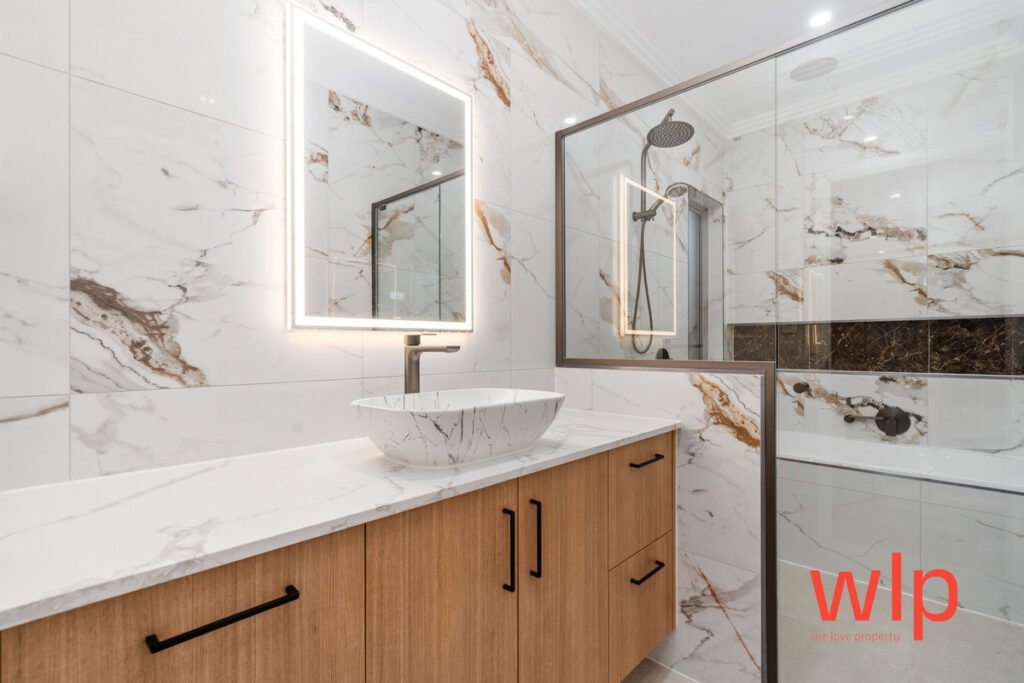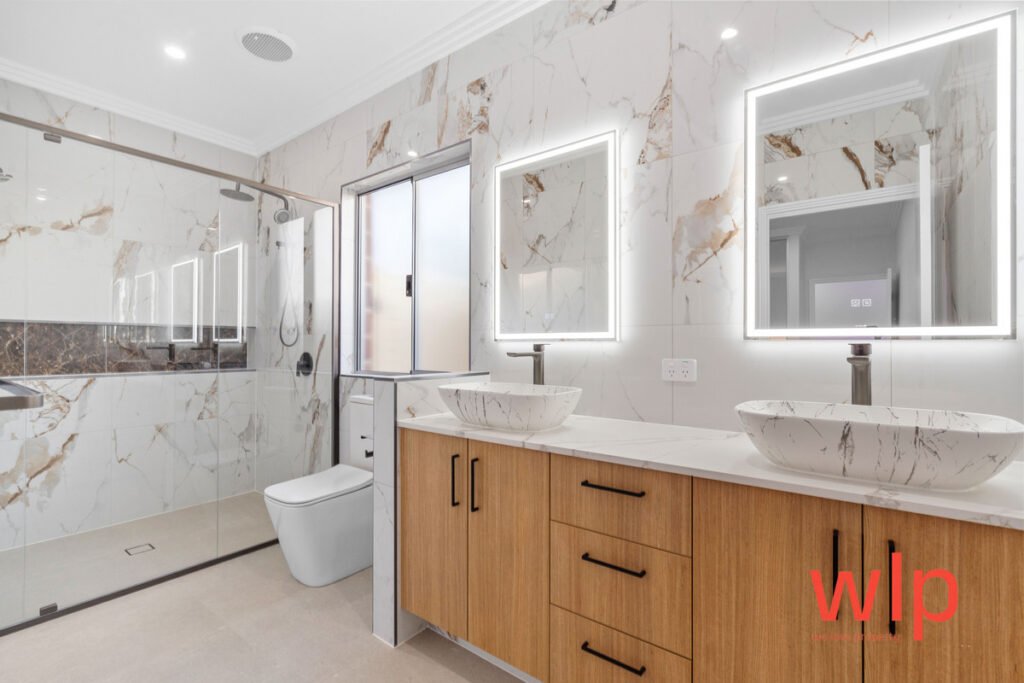Stylish bathrooms with floor-to-ceiling tiles, LED mirrors, and spa-like finishes