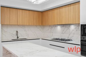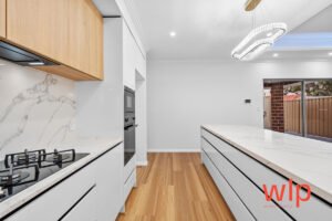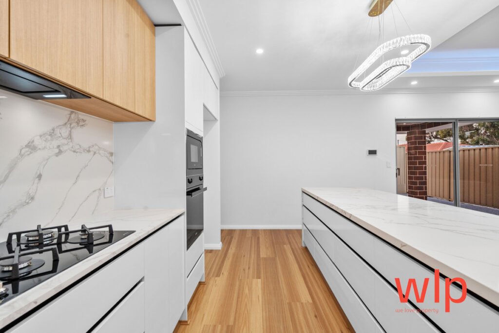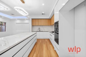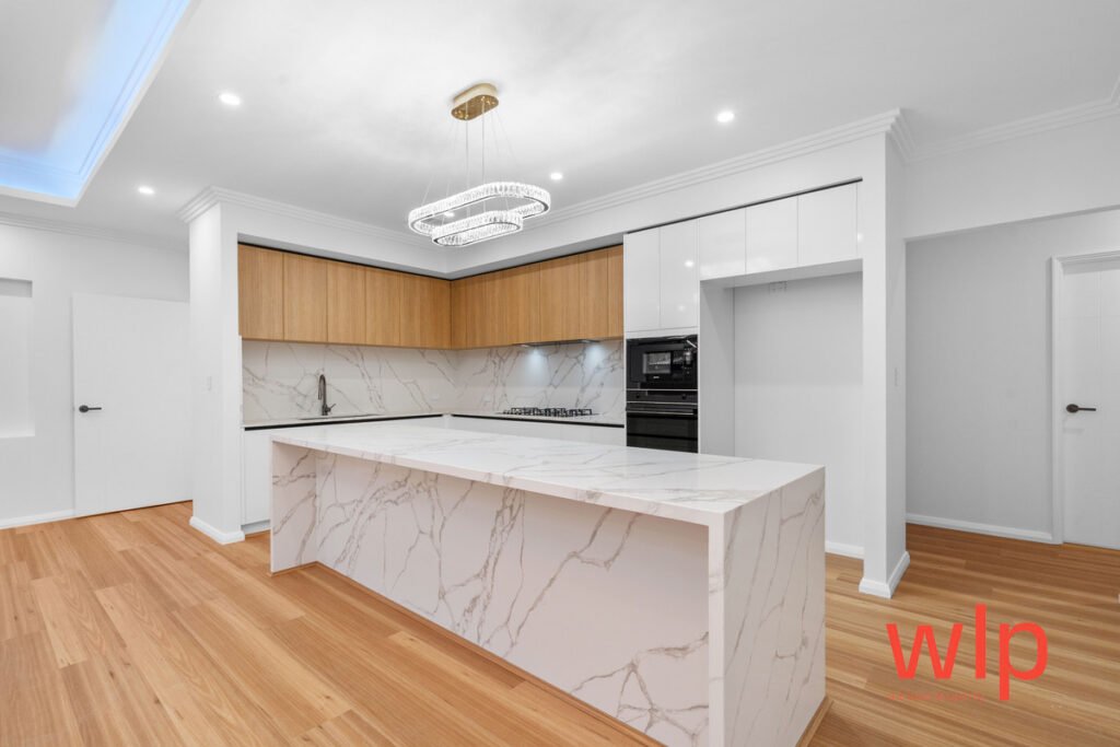 Chef’s kitchen with stone benchtops, quality stainless-steel appliances, built-in dishwasher & microwave recess