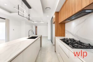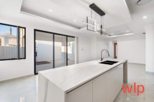 At the heart of the home is the chef’s kitchen, featuring stone benchtops with waterfall edges, premium stainless-steel appliances, soft-closing cabinetry, and a stone splashback. The open-plan living and dining area flows seamlessly outdoors to a private alfresco, ideal for entertaining or relaxing with family.