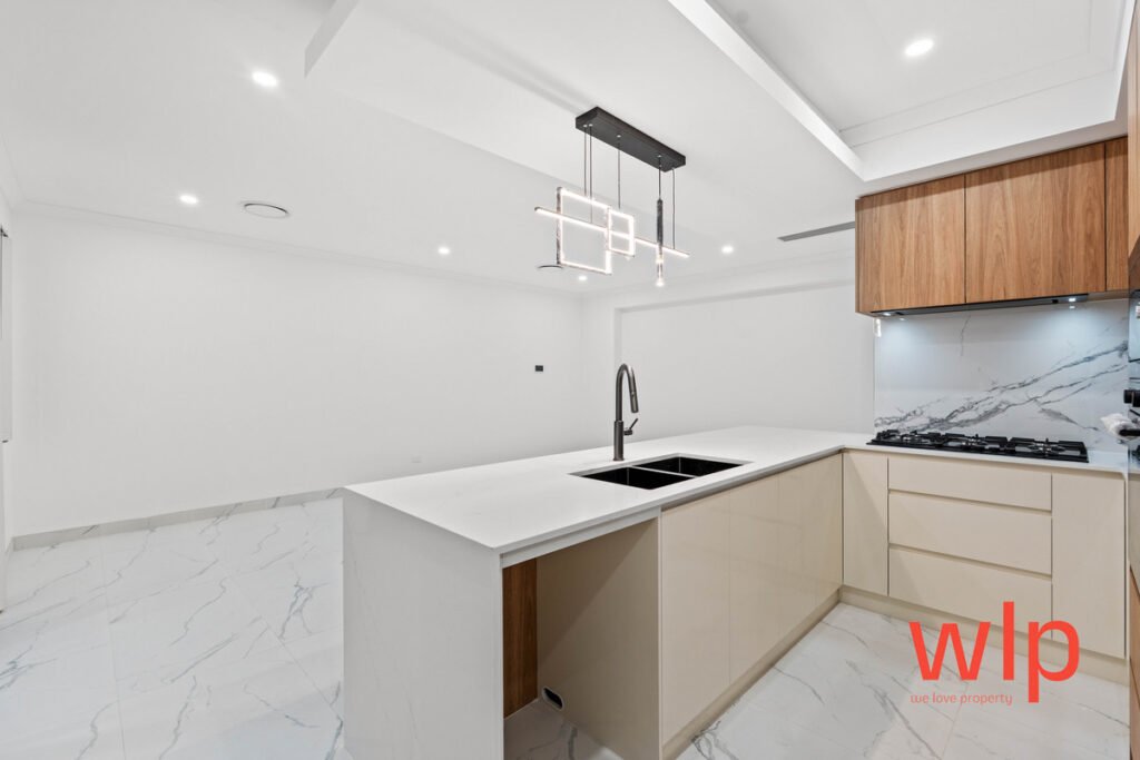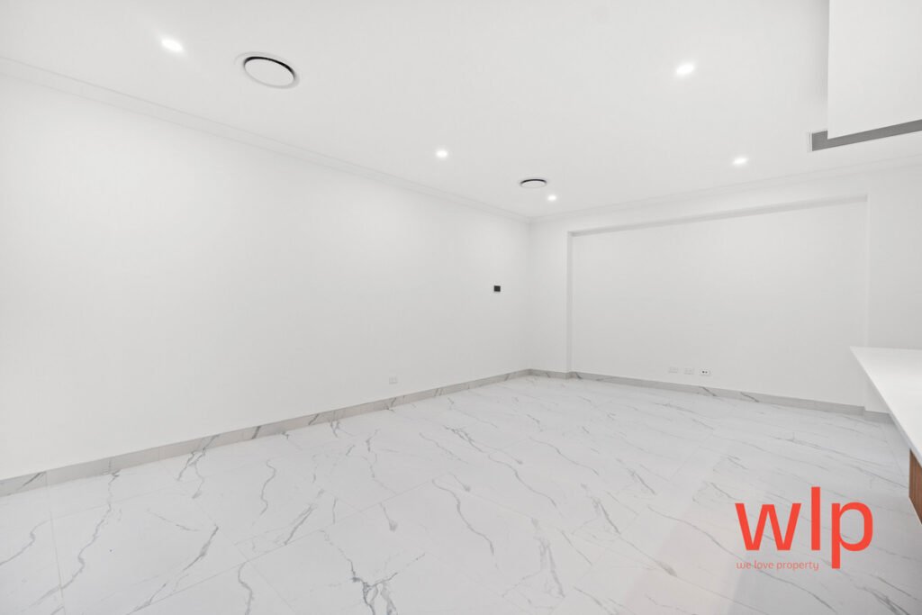 At the heart of the home is the chef’s kitchen, featuring stone benchtops with waterfall edges, premium stainless-steel appliances, soft-closing cabinetry, and a stone splashback. The open-plan living and dining area flows seamlessly outdoors to a private alfresco, ideal for entertaining or relaxing with family.