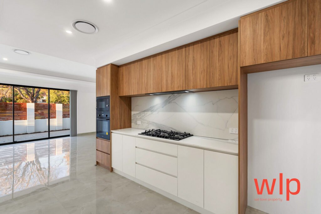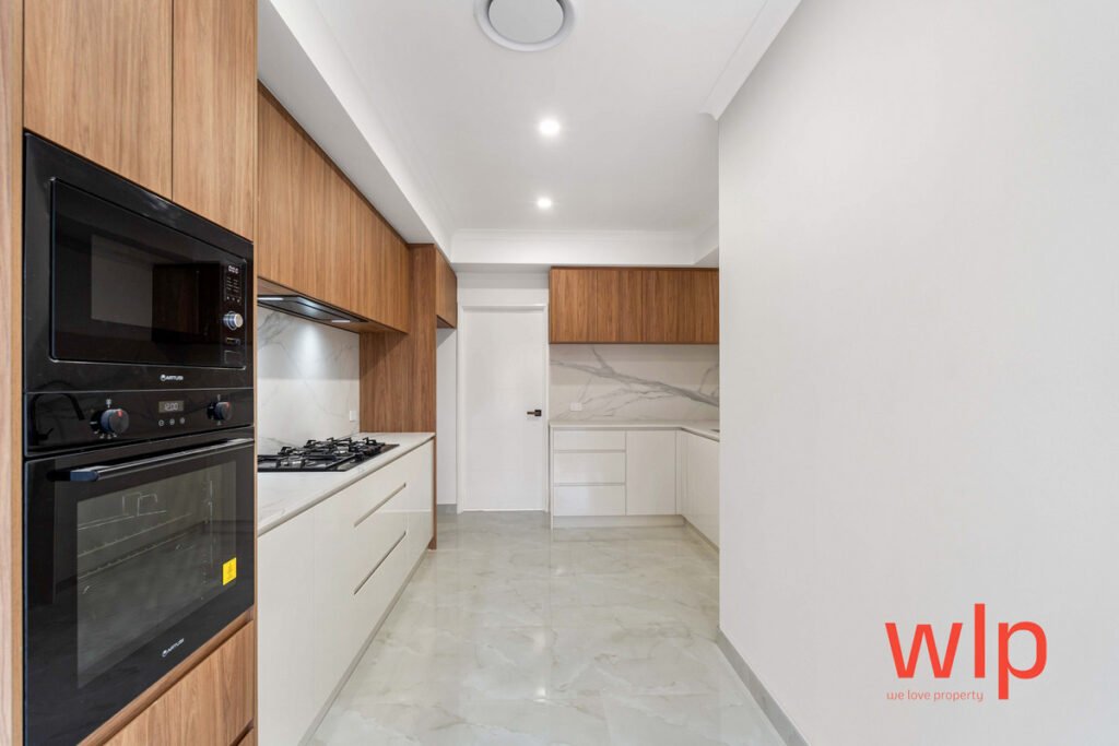 At the heart of the home is the chef’s kitchen, featuring stone benchtops with waterfall edges, premium stainless-steel appliances, soft-closing cabinetry, and a stone splashback. The open-plan living and dining area flows seamlessly outdoors to a private alfresco, ideal for entertaining or relaxing with family.