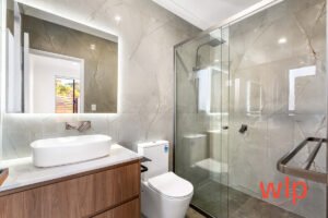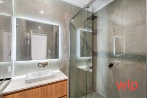 *2 bathrooms with stone benchtops, LED mirrors & floor-to-ceiling tiles